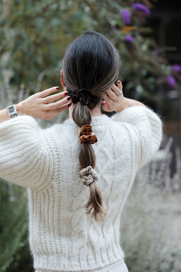 Set composto da tre scrunchie (o elastici a ruotina) in velluto in tre colori diversi.